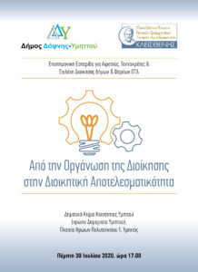 Ο Δήμος Δάφνης- Υμηττού και η Πανελλήνια Ένωση Γενικών Γραμματέων Τοπικής Αυτοδιοίκησης «Κλεισθένης» διοργανώνουν την Επιστημονική Εσπερίδα για Αιρετούς, Τεχνοκράτες & Στελέχη Διοίκησης Δήμων & Φορέων ΟΤΑ με θέμα: «Από την Οργάνωση της Διοίκησης στη Διοικητική Αποτελεσματικότητα».