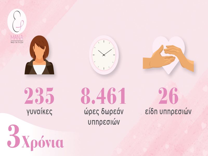 Οι αριθμοί της τριετούς επιτυχημένης πορείας «μιλούν» από μόνοι τους. Στο σύνολο, 235 γυναίκες έχουν δεχτεί τις 26, διαφορετικού τύπου, υπηρεσίες του Οργανισμού, οι οποίες φτάνουν στο σύνολο τους τις 8.461, ενώ παράλληλα, στο έργο του ΜΑΝΑ συνεισφέρουν 32 εθελοντές γιατροί, επαγγελματίες υγείας και εξειδικευμένο, στις διάφορες υπηρεσίες, προσωπικό. Επιπλέον 19 εθελοντές γιατροί και επαγγελματίες υγείας παρέχουν τις υπηρεσίες τους δωρεάν στους επαγγελματικούς τους χώρους.